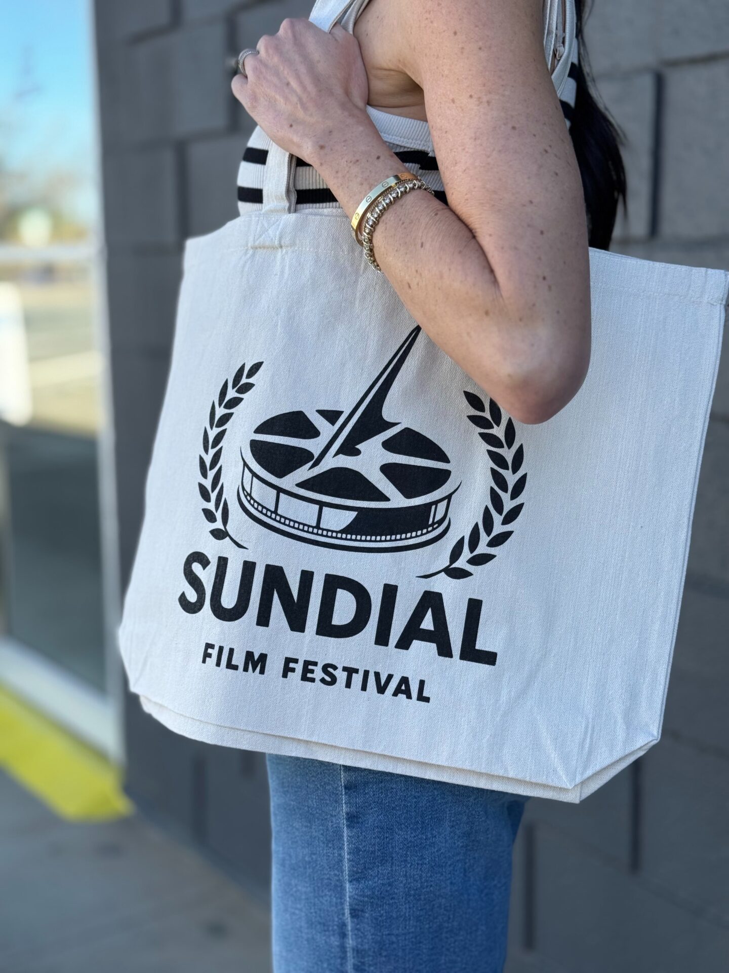 Large flat bottom canvas tote in a tan base color with black ink. A perfect bag for your go to items, groceries or a trip to the beach.